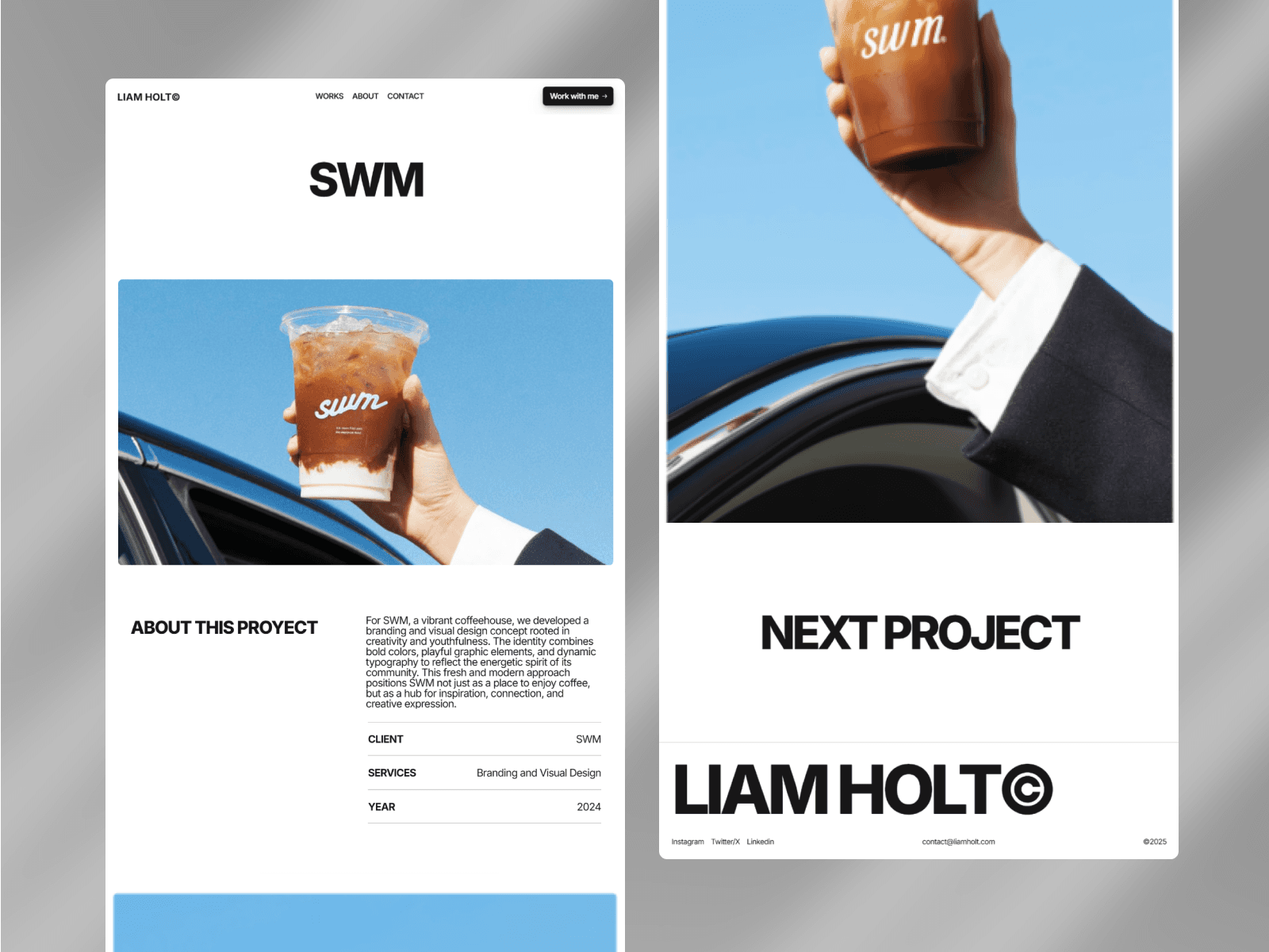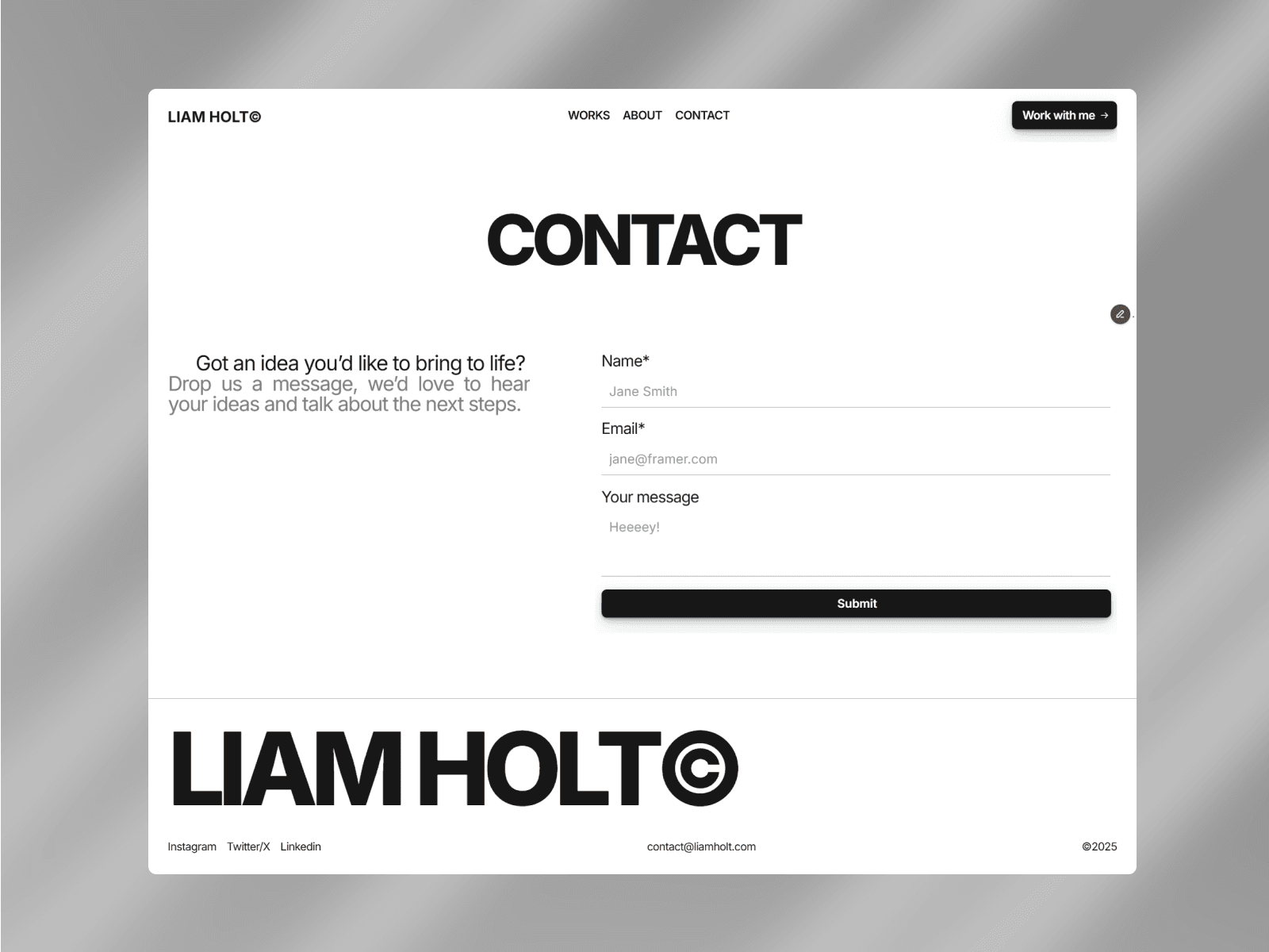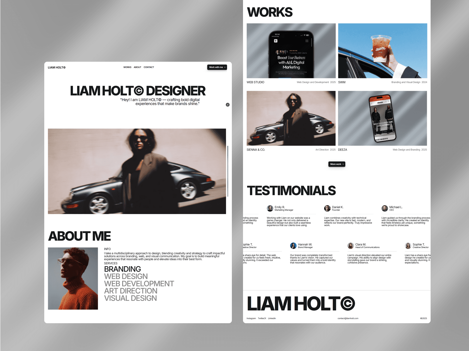 LIAM HOLT© is a premium portfolio template designed and developed for distribution on the Framer Marketplace. The project was created to offer creatives a refined, modern framework for presenting their work with clarity, confidence, and visual impact.